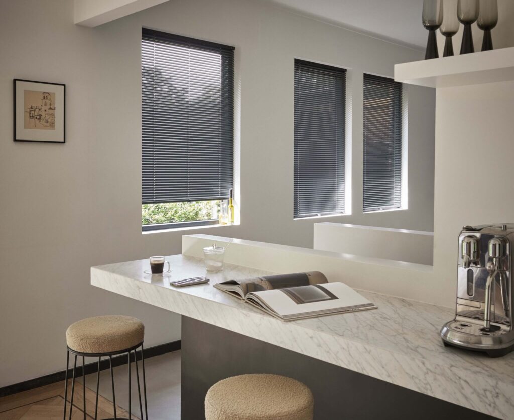 Klassisk og funksjonell solskjerming med justerbare lameller. Enkel å tilpasse lysforholdene etter behov, både hjemme og på kontoret.
